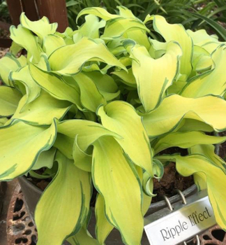 Exkluzívny vtáčí zob so svetlozelenými listami a zlatožltým lemom na okraji.