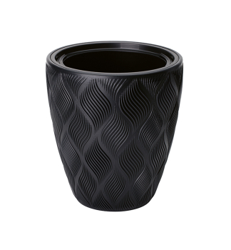 Plastový kvetináč zdobený zvislými pruhmi v antracitovej farbe.