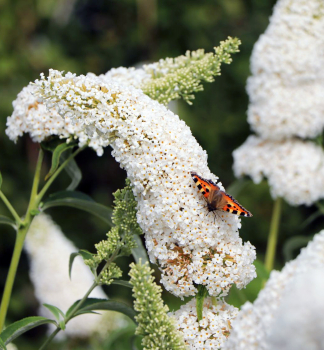 Pôvabný kultivar metlinatej hortenzie s veľkými belavými súkvetiami.