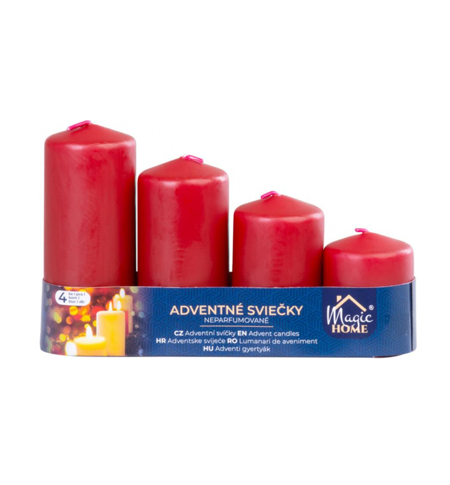 Charakteristika: Adventné sviečky MagicHome skvele dotvoria čarovnú atmosféru Vianoc u Vás doma. Perfektne sa hodia na dotvorenie do advetných vencov či dekorácií. 4 rôzne výšky - 4,8x6 cm - váha vosku 85g, 4,8x8 cm - váha vosku 110 g, 4,8x10 cm - váha vosku 140 g, 4,8x12 cm - váha vosku 170 g. Farba: bordová.