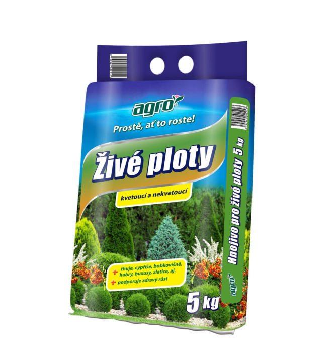 Charakteristika: Hnojivo na živé ploty je určené pre prihnojovanie všetkých druhov živých plotov (tuje, cyprušteky, vtáči zob, vyvrínovce, hraby a podobne). Je možné ho použiť pri výsadbe rastlín, ale aj počas celého vegetačného obdobia. Vďaka optimálnemu pomeru dusíka, fosforu a vysokého obsahu draslíka spĺňa požiadavky na zdravý vývoj a silný rast drevín. Vyšší obsah horčíka pôsobí preventívne proti žltnutiu a následnému hnednutiu listov a ihličia.