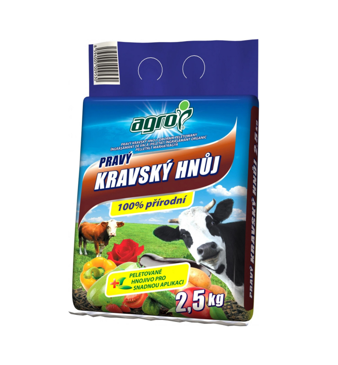 Charakteristika : Agro kravský hnoj je organické hnojivo vyrobené z kravského hnoja pomocou sušenia a lisovania. Granulovaná forma hnojiva uľahčuje manipuláciu. Hnojivo používame na základné hnojenie pred výsadbou rastlín vyžadujúcich organické hnojenie (zemiaky, repa, zeler, hlúboviny, plodová zelenina). Ďalej je jeho použitie vhodné pre vyhnojenie kvetinových záhonov a pre prípravu pôdy pred výsadbou stromov a kríkov.