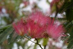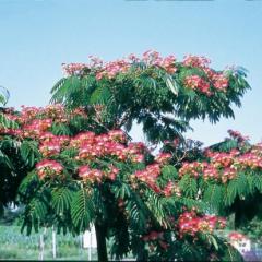 Neobyčajný hodvábny strom s tmavšími listami a sýtoružovými kvetmi.