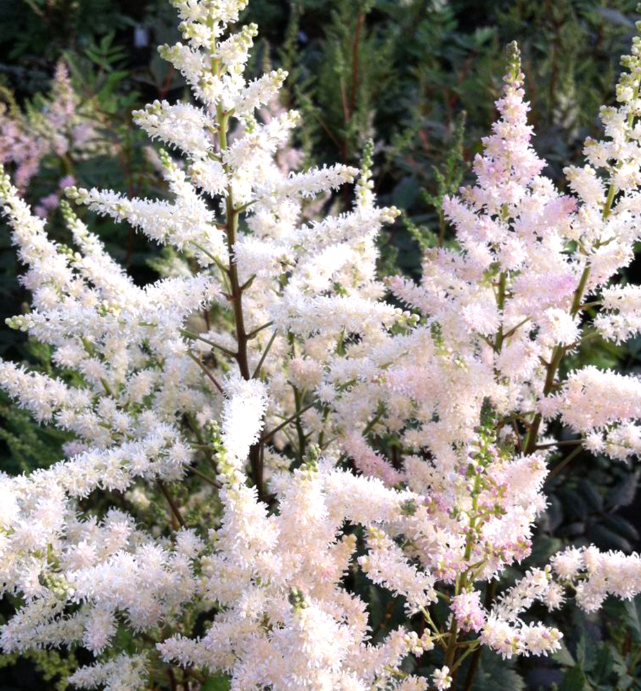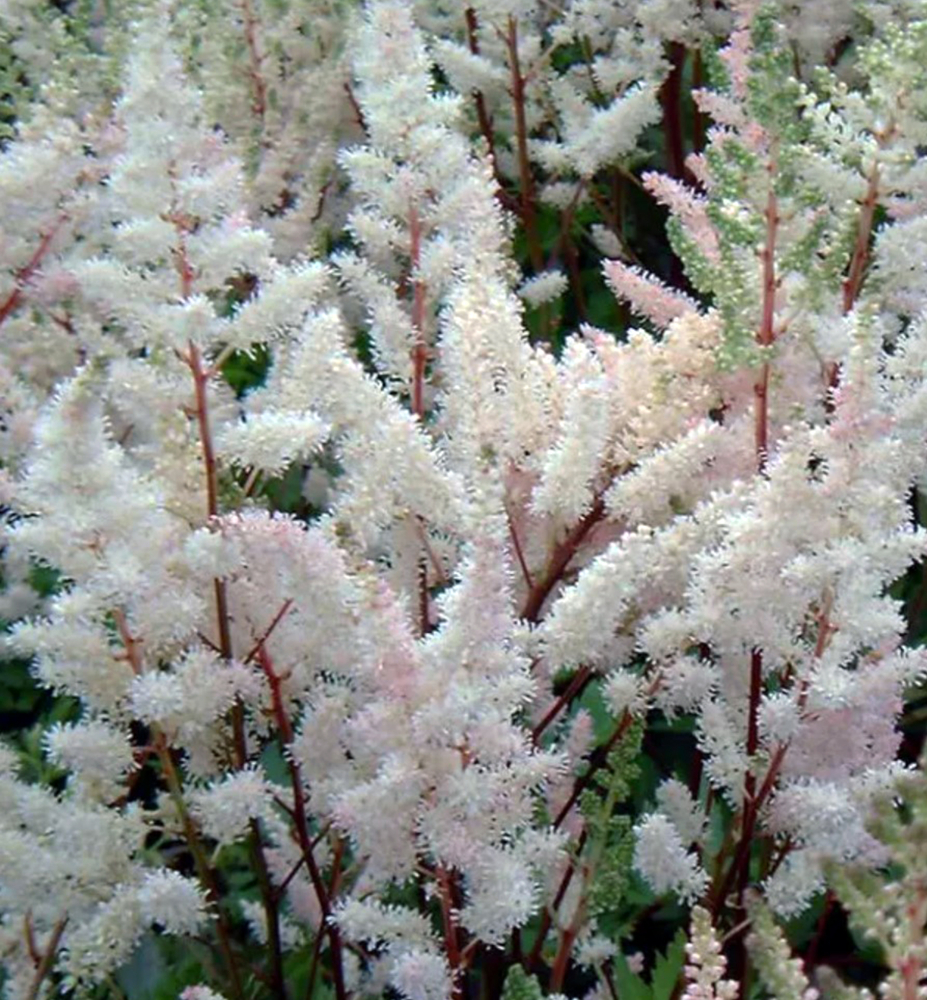 Nenáročná astilba s bielymi kvetmi a ružovým nádychom, vhodná do črepníka.