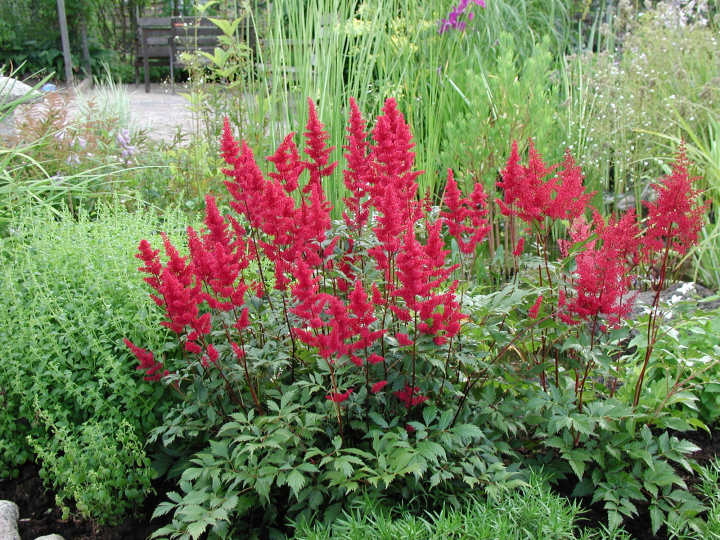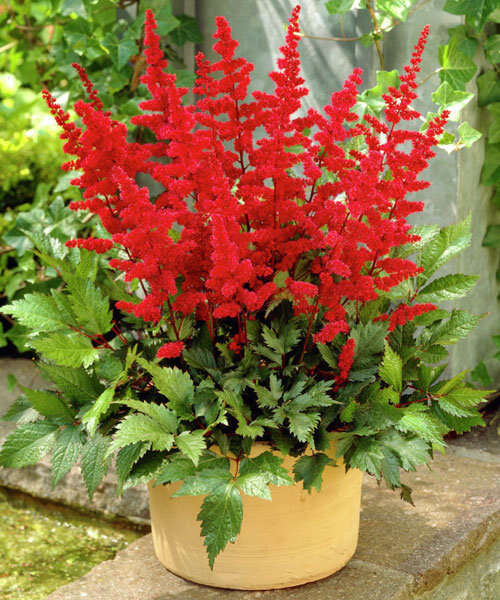 Elegantná vyššia astilba s čarokrásnymi červenými metlinami a dekoratívnymi listami.