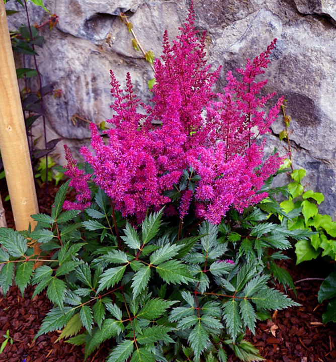 Charakteristika: Kultivar ´VISION VULCANO®´ je nižšia kompaktná astilba s atraktívnymi malinovoružovými kvetmi. Dorastá do výšky 30-50 cm, preto je vhodná na výsadbu do črepníkov alebo na okraj tienistých trvalkových záhonov. Listy sú pri rašení vínovočervené, neskôr tmavozelené. Vďaka výraznému hlboko strihanému tvaru sú atraktívne počas celého roka. Kompaktný a hustý vzrast prispieva k menšiemu rastu buriny.