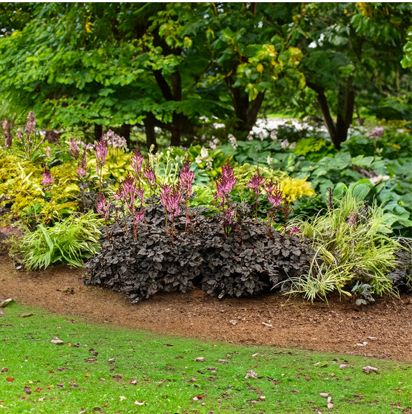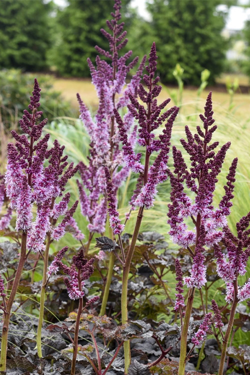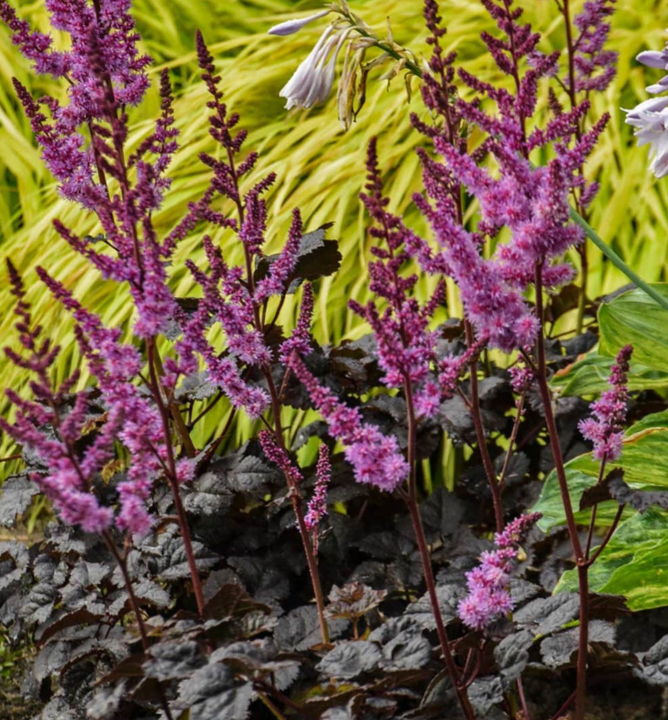 Výrazná astlilba s čokoládovými listami a ružovofialovými metlinami.