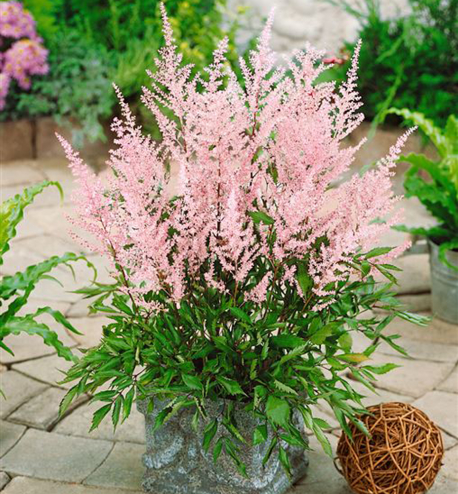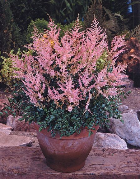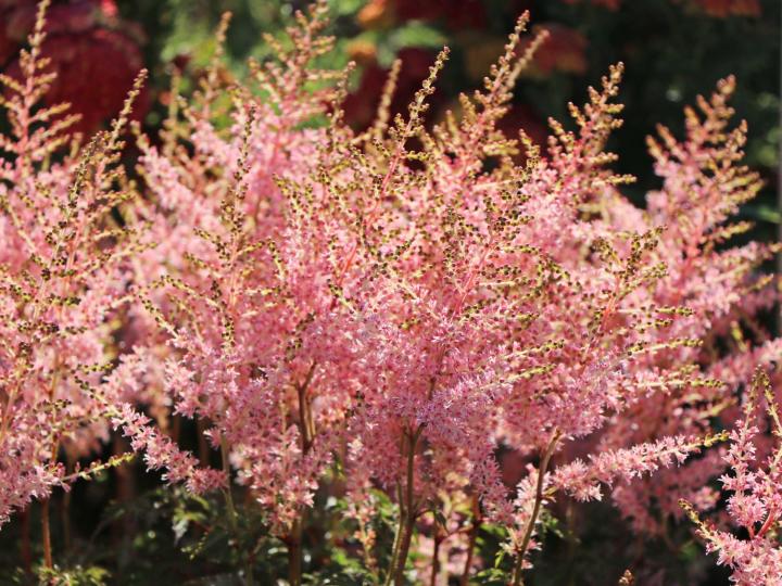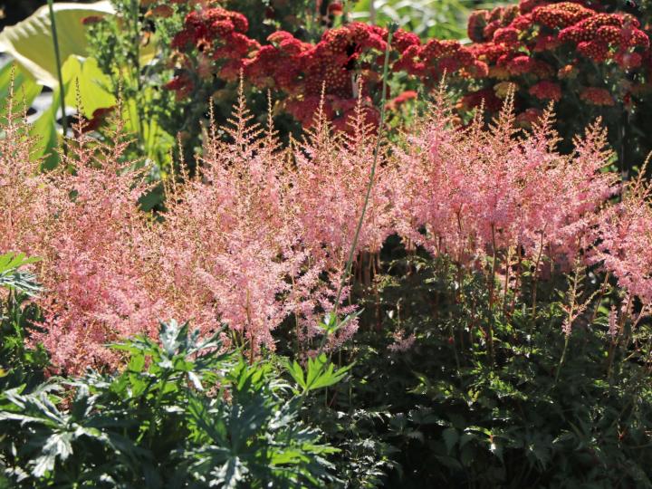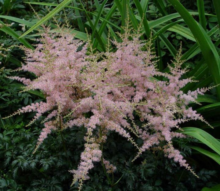 Pôvabná astilba s bohatým kvitnutím jemných ružových kvetov.