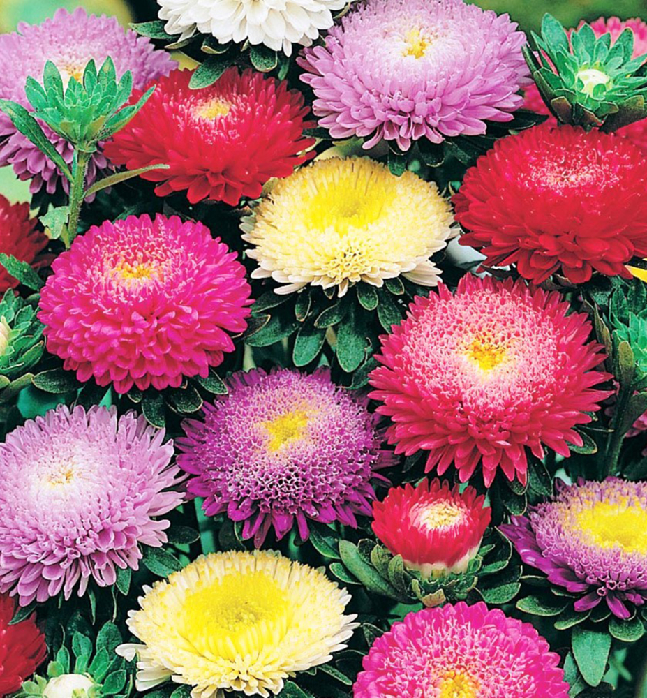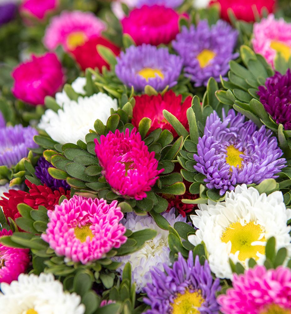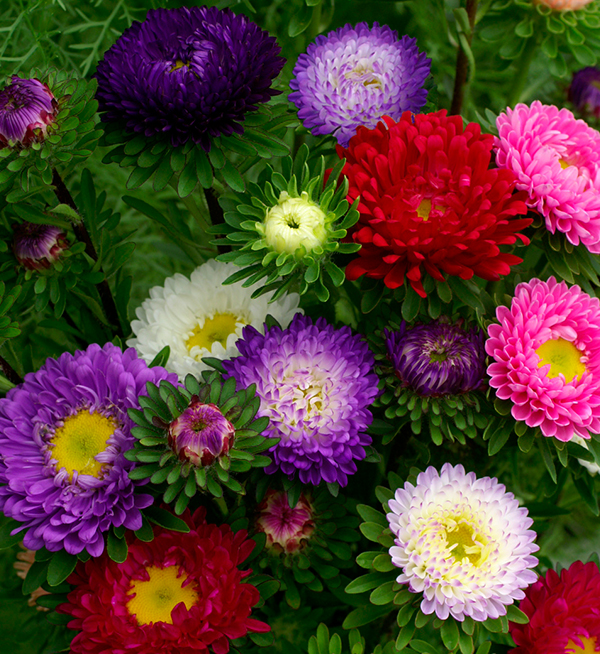 Pestrý mix vysokých astier s veľkými kvetmi, vhodnými k rezu.