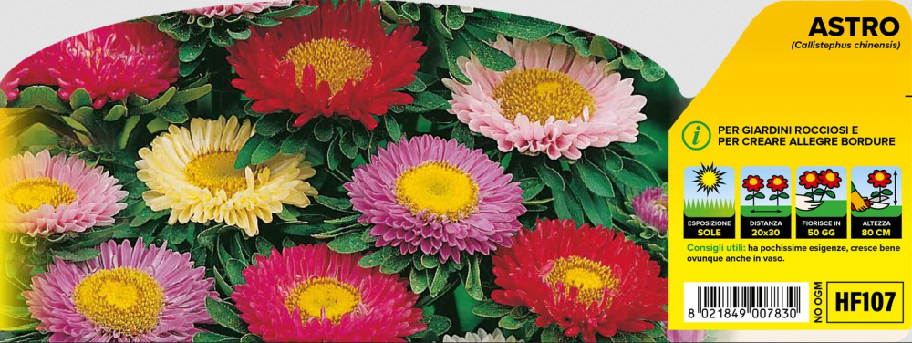 Charakteristika: Astra je letnička, ktorá pôvodom pochádza z Ázie. Kvitne v letných mesiacoch v pestrých odtieňoch ružovej, fialovej, červenej, bielej a žltej farby. Stred kvetov je dozdobený pútavým žltým očkom. Rastie do výšky približne 80 cm, kvety sú vhodné k rezu do kytíc a kvetinových aranžmánov. Môžu sa pestovať priamo v záhone, ale aj v črepníkoch.