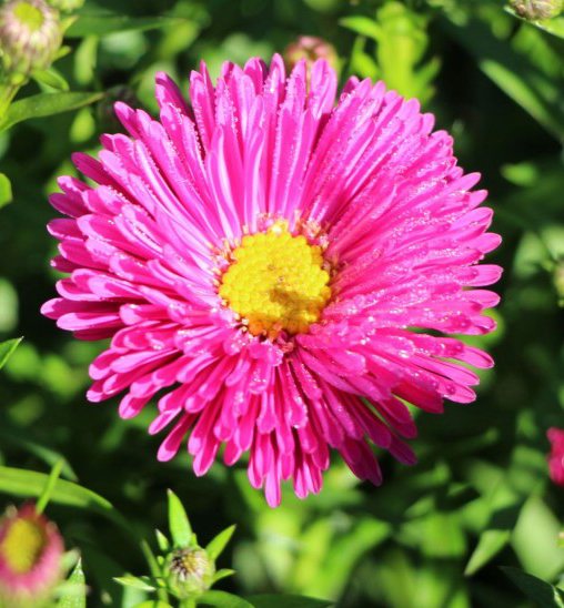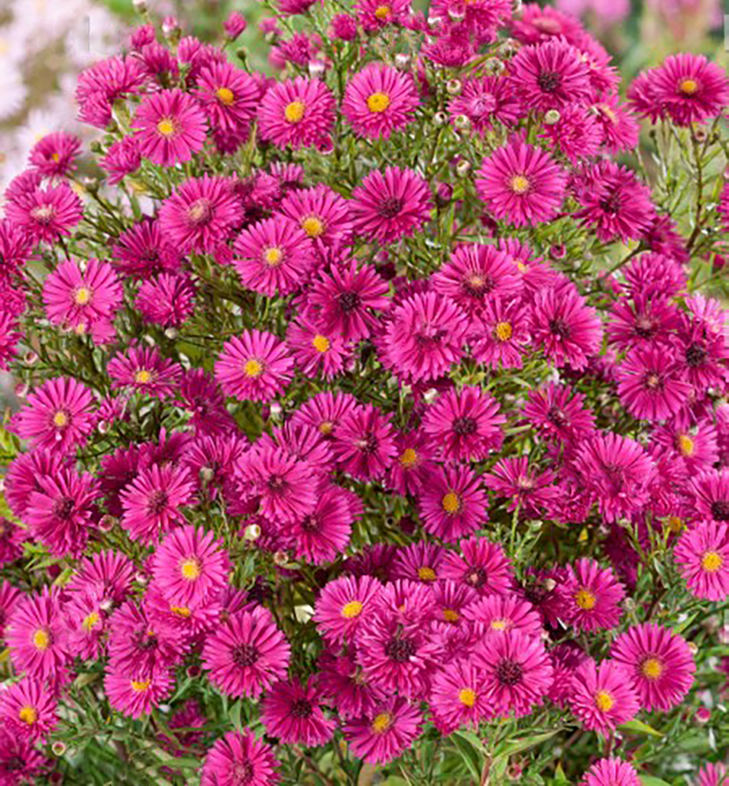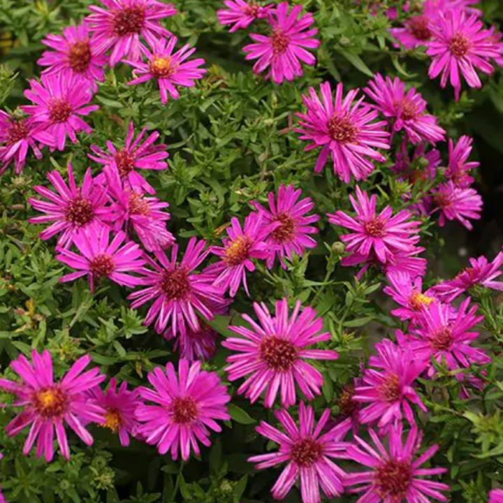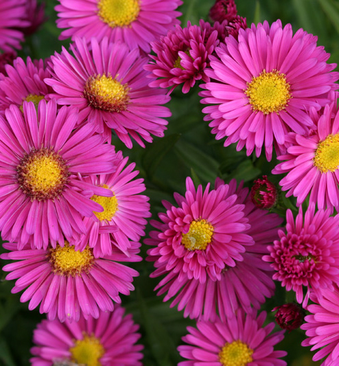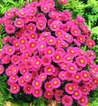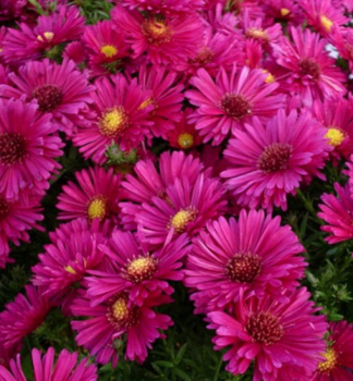 Bohato kvitnúca nízka astra s výraznými ružovo červenými kvetmi so žltým stredom.