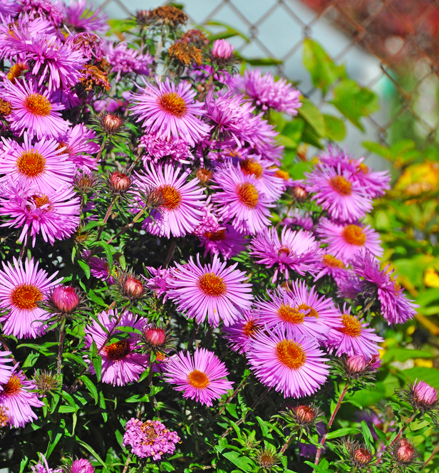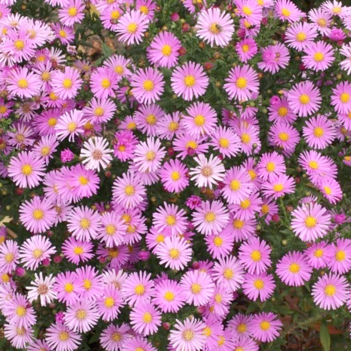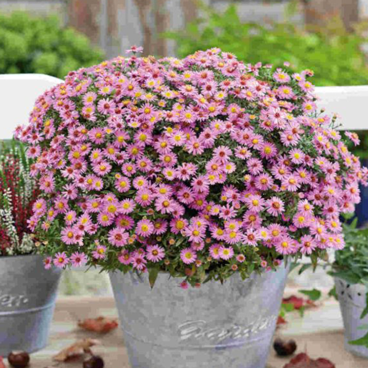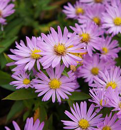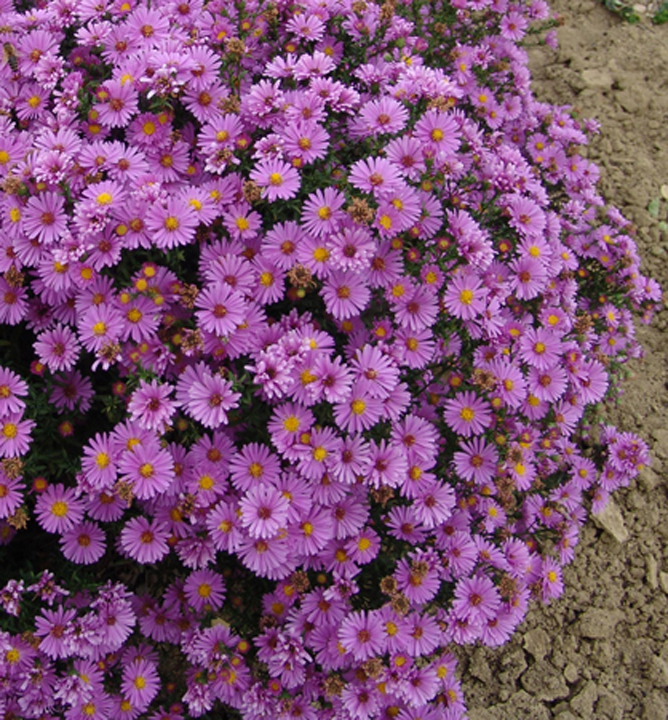 Nižšia jesenná astra kompaktného tvaru, bohato kvitnúca fialovoružovými kvetmi.