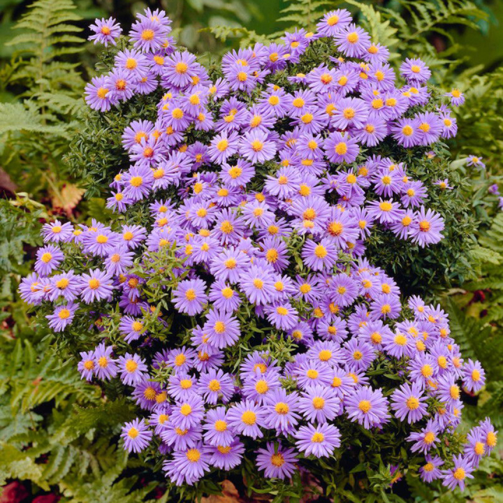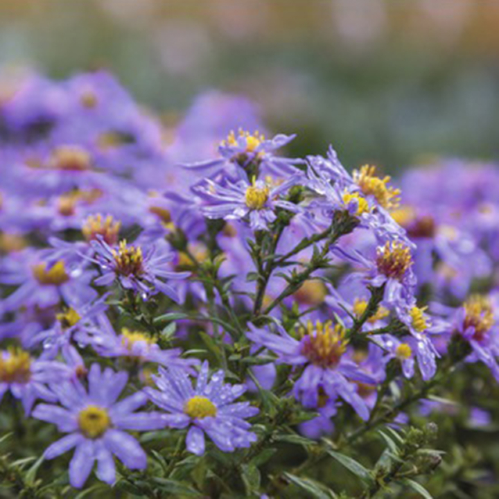 Nižšia kompaktná jesenná astra s množstvom svetlých modrofialových kvetov.