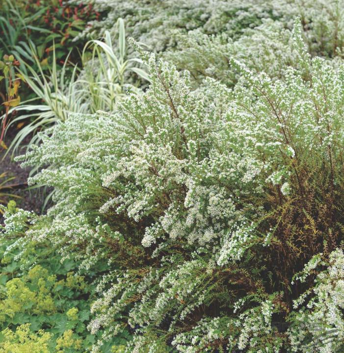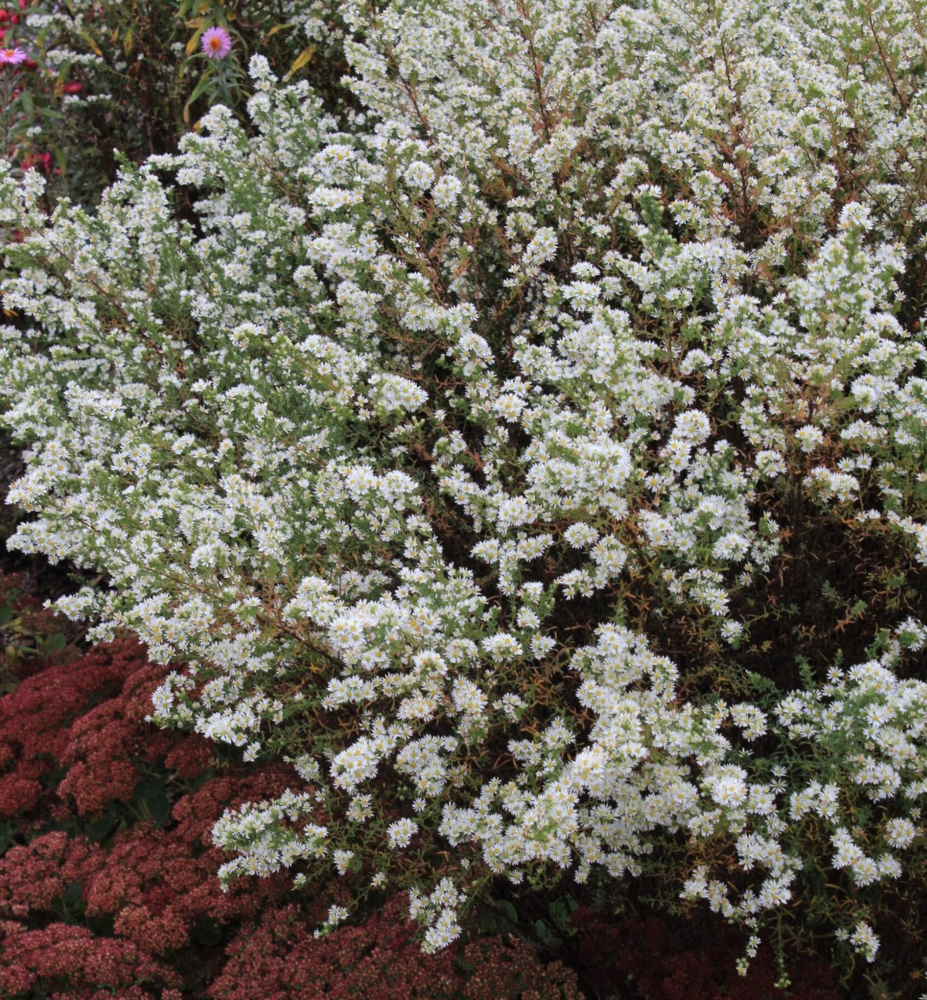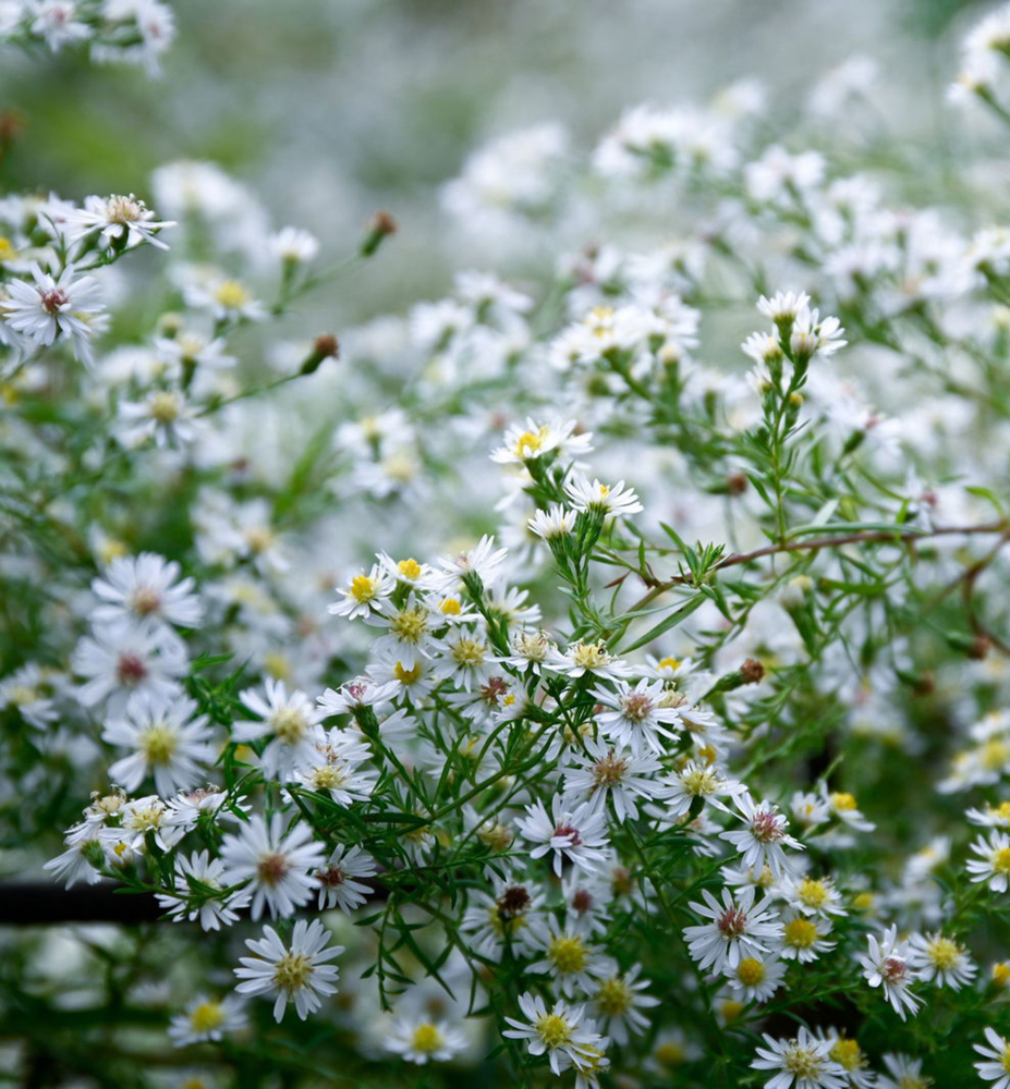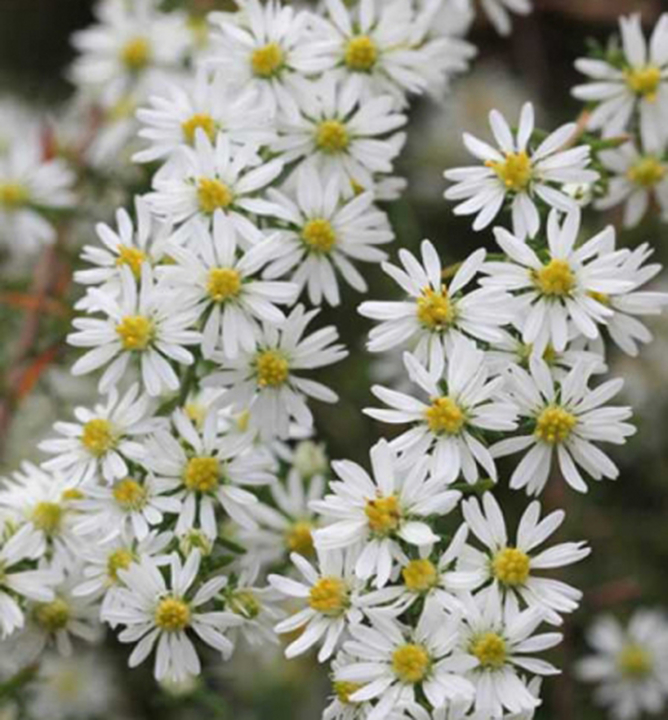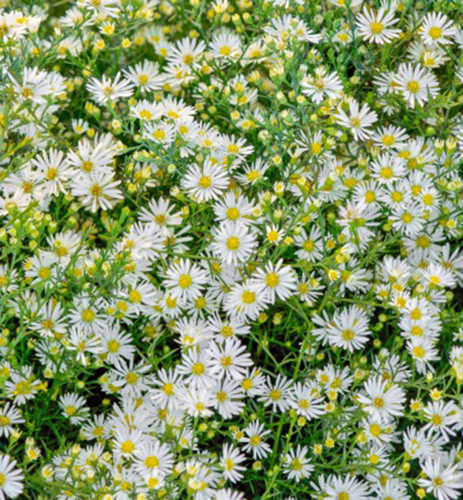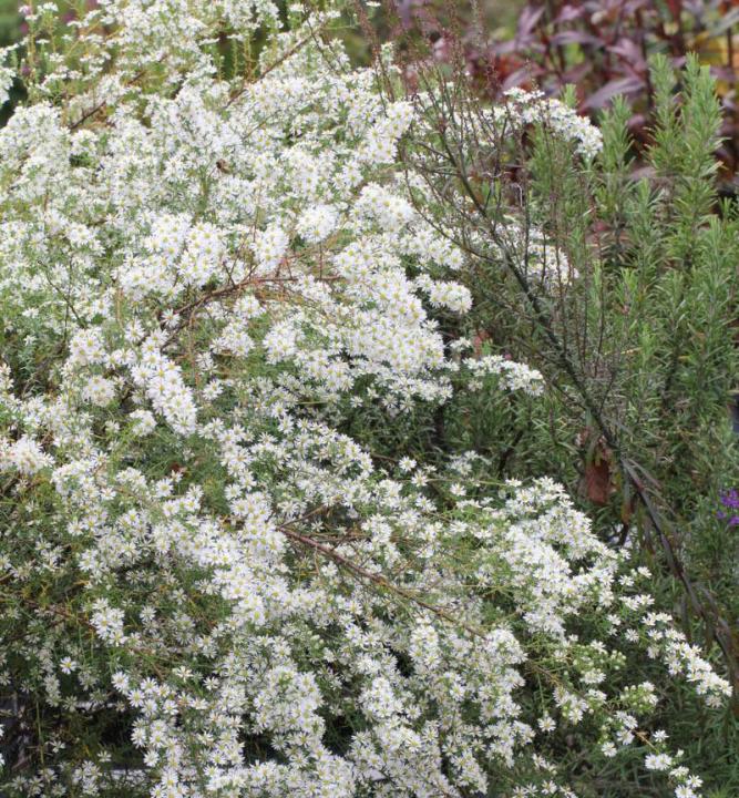 Bohato kvitnúca astra " Snehový tanec" tvoriaca trsy s jemnými bielymi kvetmi na jeseň.