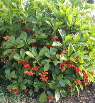 Charakteristika: Aukuba ´ROZANNIE´, nazývaná aj japonský vavrín, je nenáročný tieňomilný stálezelený ker, rastúci súmerne do výšky a šírky približne 1-1,5 m. Najviac však púta pozornosť od septembra, kedy začína produkovať výrazné červené plody. Tie sa vytvárajú z nenápadných bordovofialových kvetov, ktoré aukuba nesie už od mája. Aukuba je dvojdomá rastlina. ´Rozannie´ je samoplodá samičia odroda, ak však chcete doiahnuť viac plodov, je potrebné vysadiť aj samčí ker. Sýtozelené listy sú lesklé, oválne, so zubkovaným okrajom. Je mrazuvzdorná do -20°C.