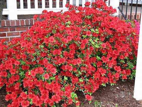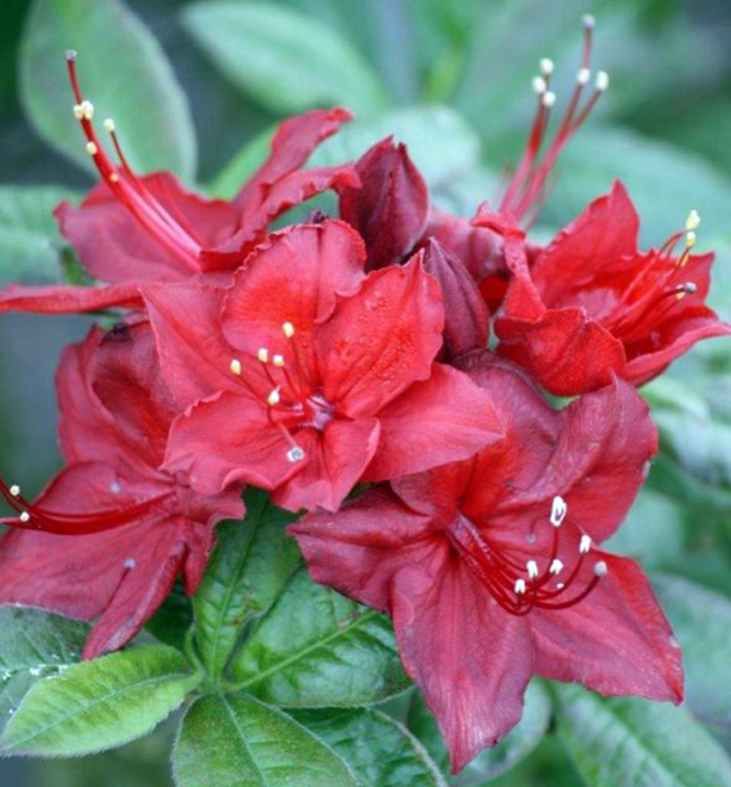 Nižšia odroda rododendronu s množstvom žiarivo červených kvetov.