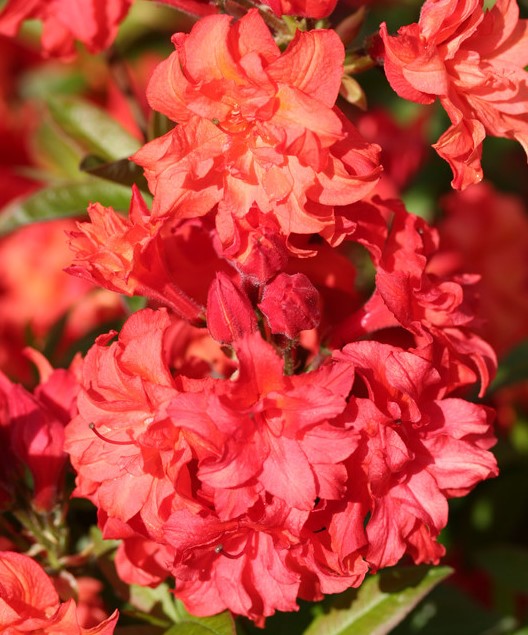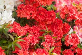Nižšia odroda rododendronu s množstvom žiarivo červených kvetov.