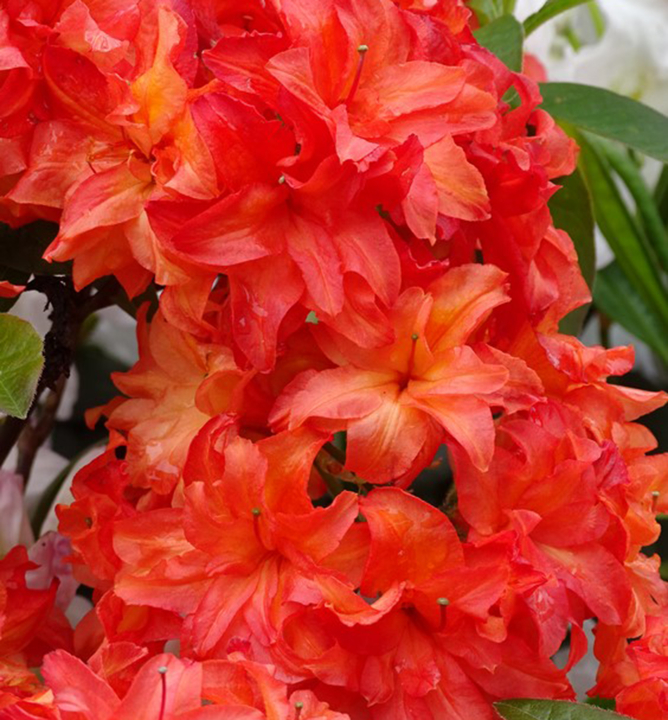 Neprehliadnuteľná azalka so žiarivými červenými kvetmi s oranžovým nádychom.