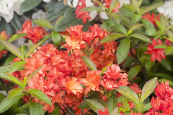 Bohato kvitnúca azalka s oranžovočervenými kvetmi a lesklými listami.
