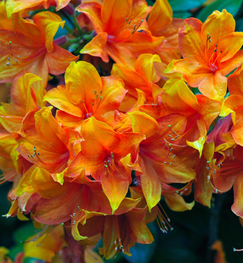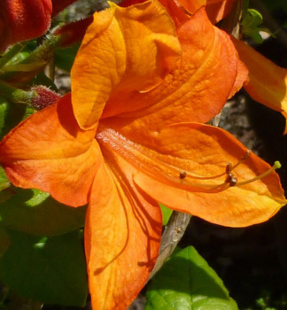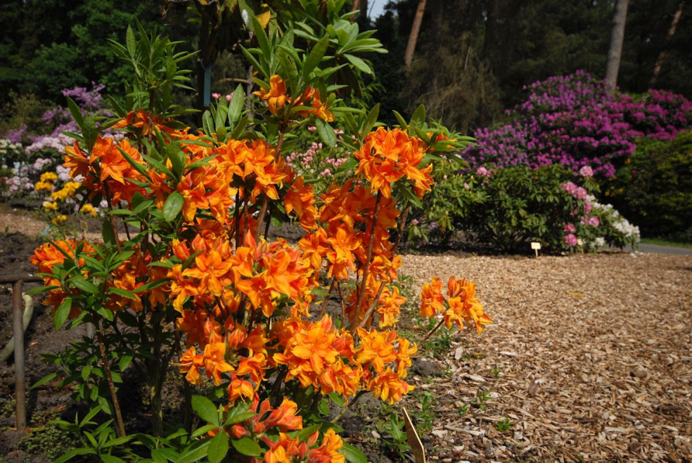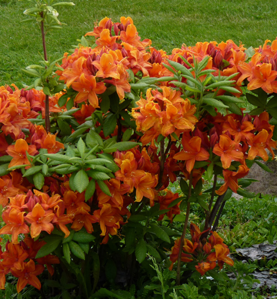 Veľkokvetá azalka "Zlatý orol" - nádherná dominanta so žiarivými oranžovými kvetmi.