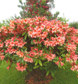 Nižšia odroda rododendronu s množstvom žiarivo červených kvetov.