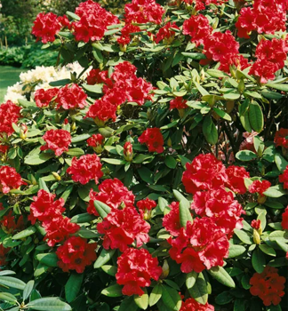 Nižšia odroda rododendronu s množstvom žiarivo červených kvetov.