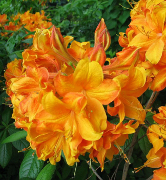 Nádherná veľkokvetá azalka so žiarivými zlatožltými kvetmi a oranžovou kresbou.