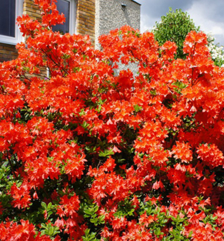 Neprehliadnuteľná azalka so žiarivými červenými kvetmi s oranžovým nádychom.