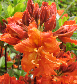 Veľkokvetá azalka žiarivooranžovej farby s mierne zvlnenými okrajmi kvetov.