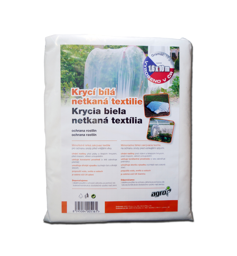 Charakteristika: Biela netkaná textília slúži ako ochrana rastlín pri nepriaznivom počasí, je priepustná pre vodu, svetlo a vzduch, zamedzuje nadmernému vyparovaniu vody z pôdy, zatepľuje, chráni rastliny proti lietajúcim škodcom, chráni pred mrazmi a chladom, dažďom, vetrom a nadmerným slnkom.