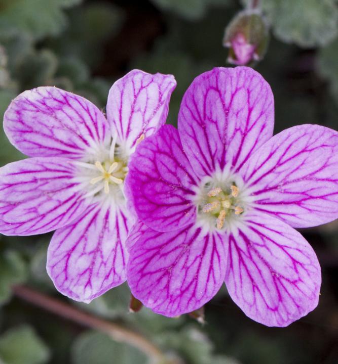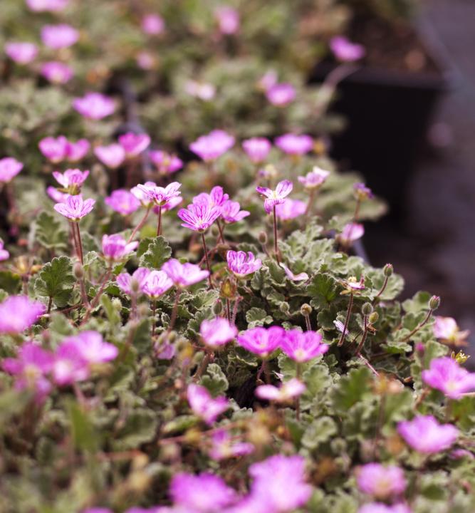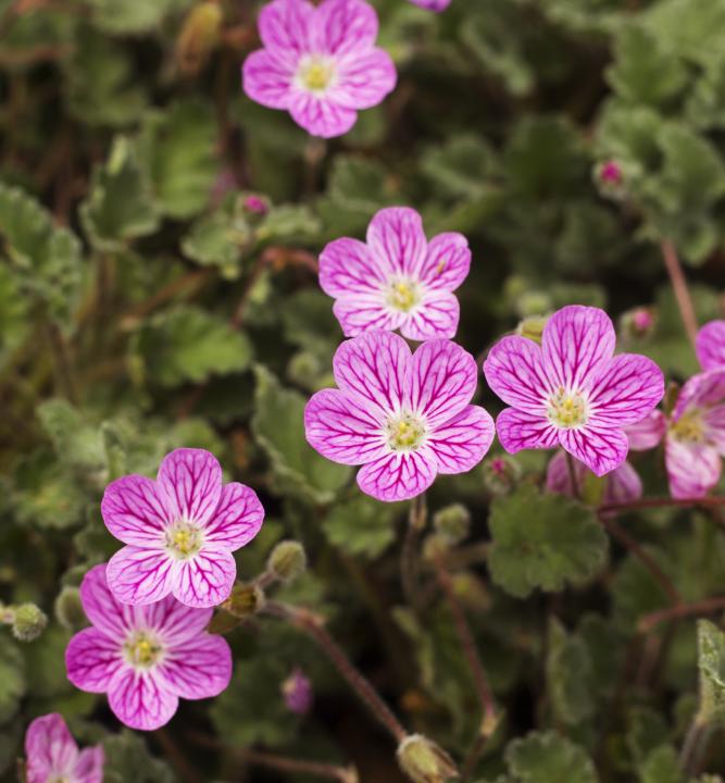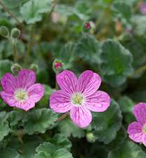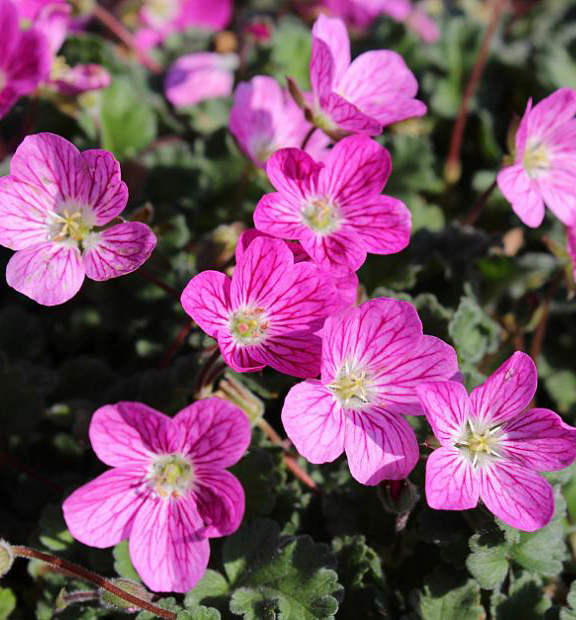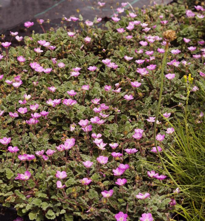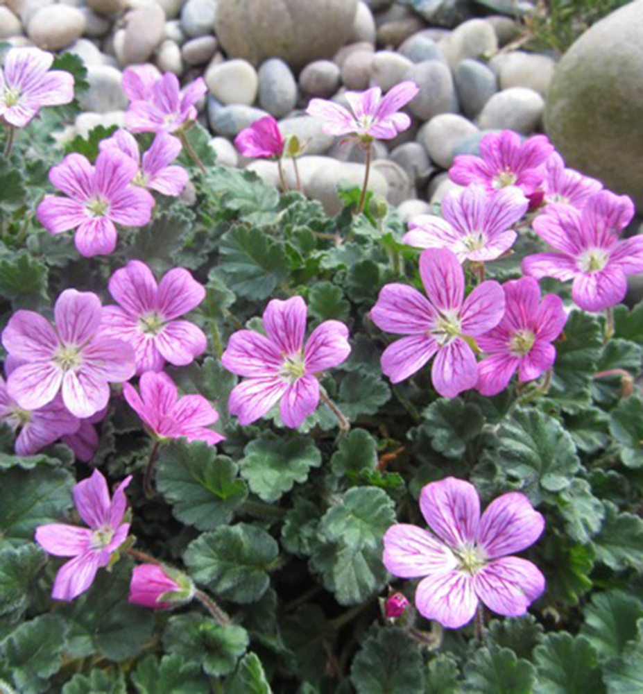 Obľúbená pôdopokryvná odroda so svetloružovými kvetmi s výraznou fialovou žilnatinou.