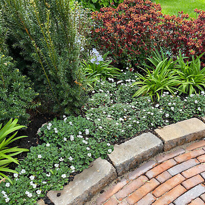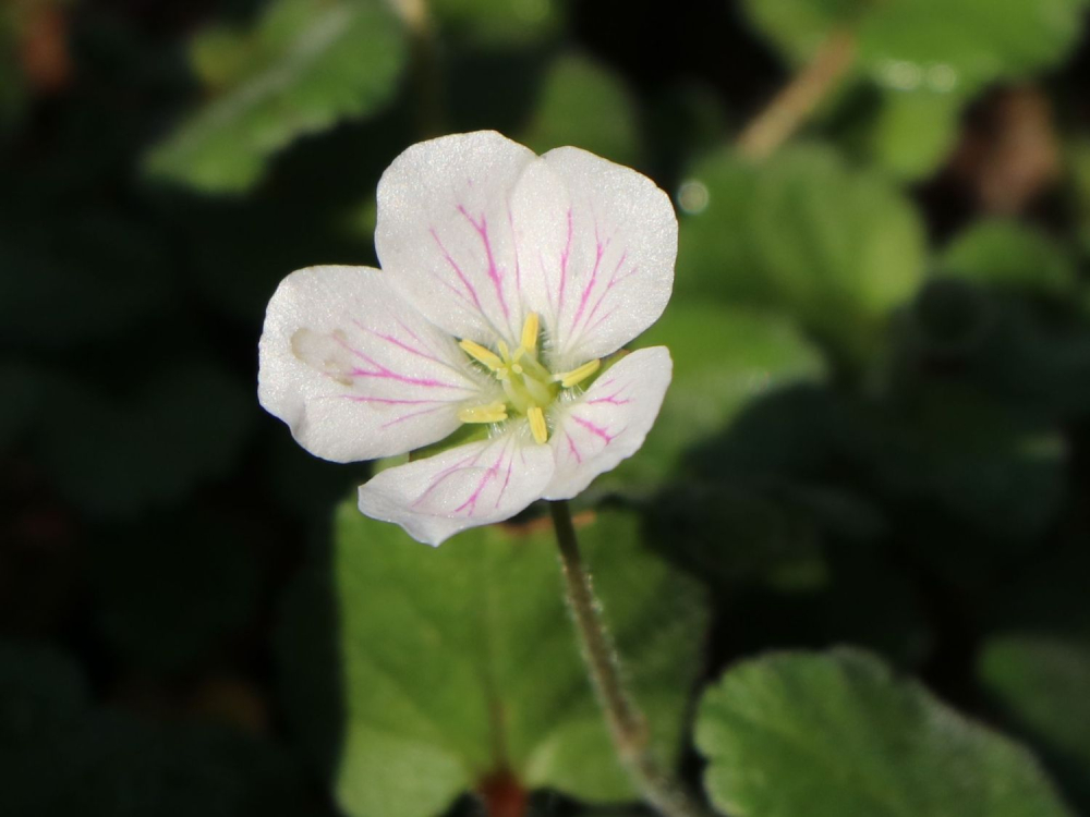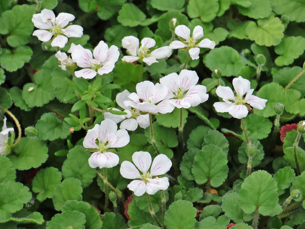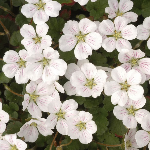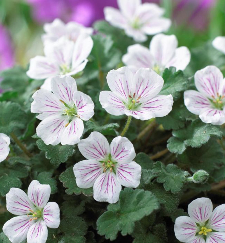Dlho kvitnúca trvalka s bielymi kvetmi s fialovou žilnatinou a pôdopokryvným vzrastom.