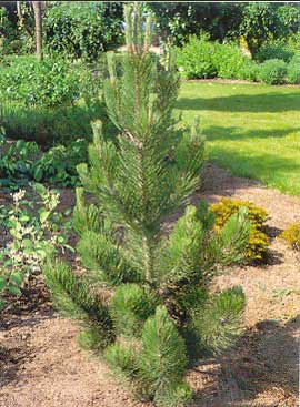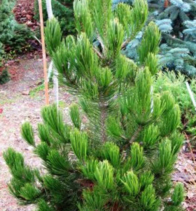 Hustá, dominantná kužeľovitá borovica s dlhými, jasno zelenými ihlicami.