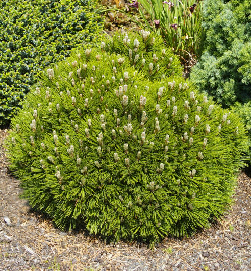 Trpasličia, pomaly rastúca guľovitá borovica s tmavozeleným ihličím.