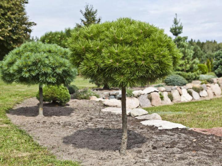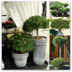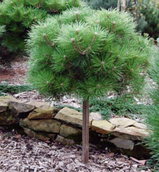 Trpasličia, pomaly rastúca guľovitá borovica s tmavozeleným ihličím.