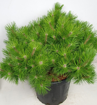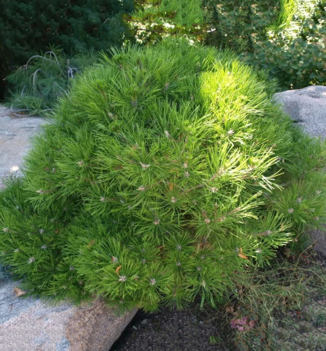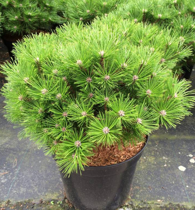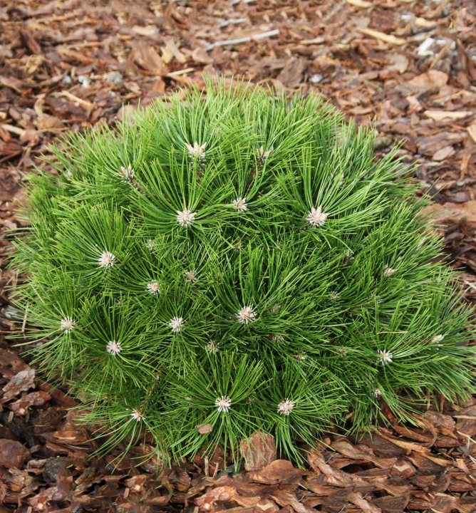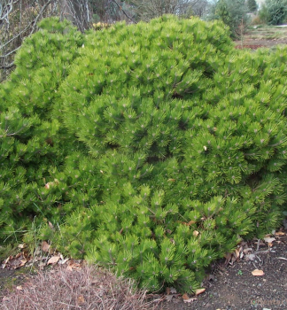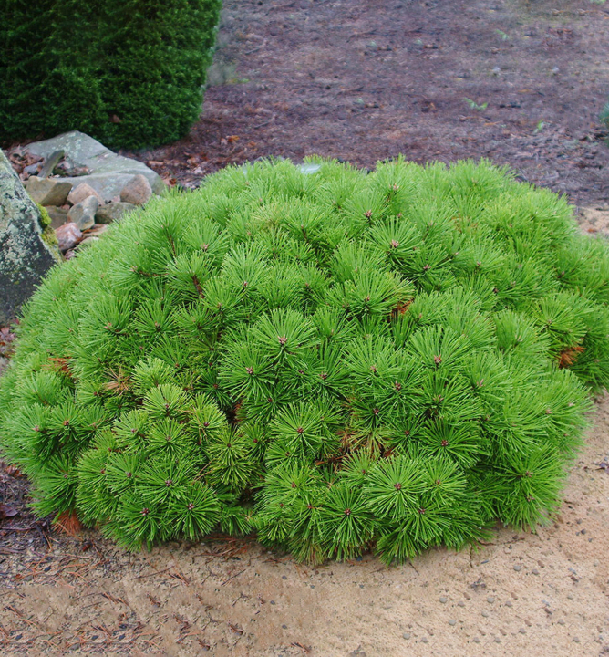 Trpasličia, pomaly rastúca guľovitá borovica s tmavozeleným ihličím.