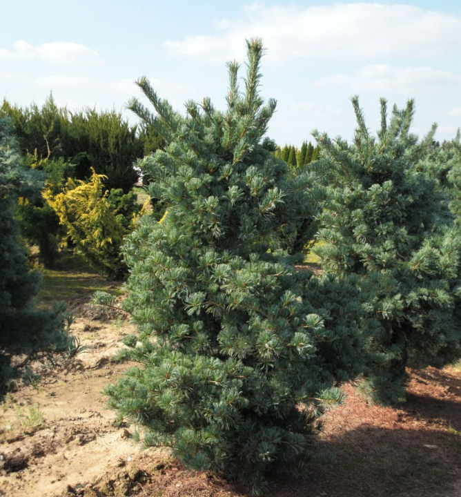 Hustá, dominantná kužeľovitá borovica s dlhými, jasno zelenými ihlicami.
