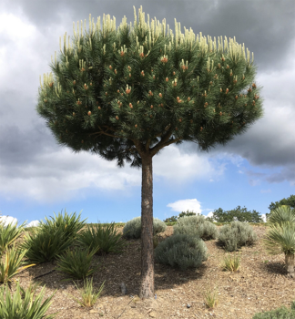 Hustá, dominantná kužeľovitá borovica s dlhými, jasno zelenými ihlicami.