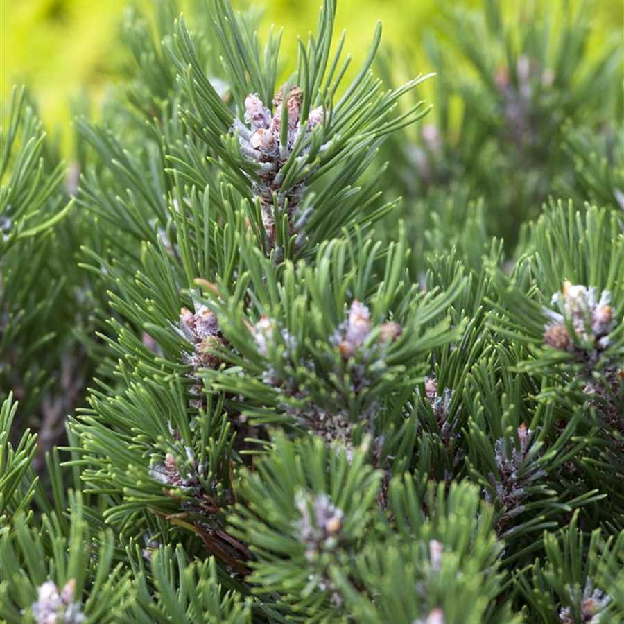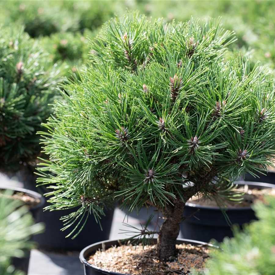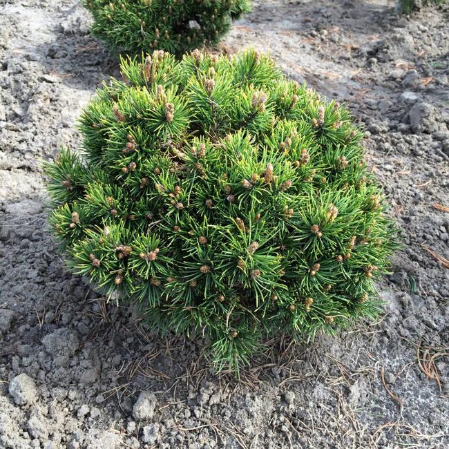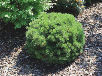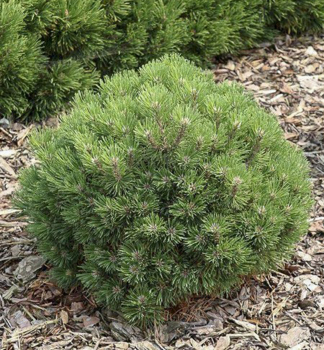 Kompaktná borovica guľovitého tvaru so stredne dlhými tmavozelenými ihlicami.