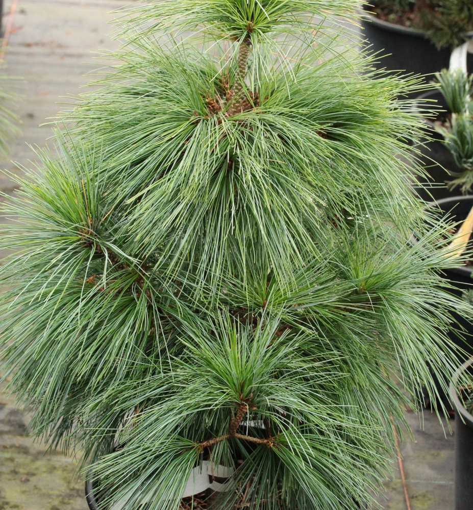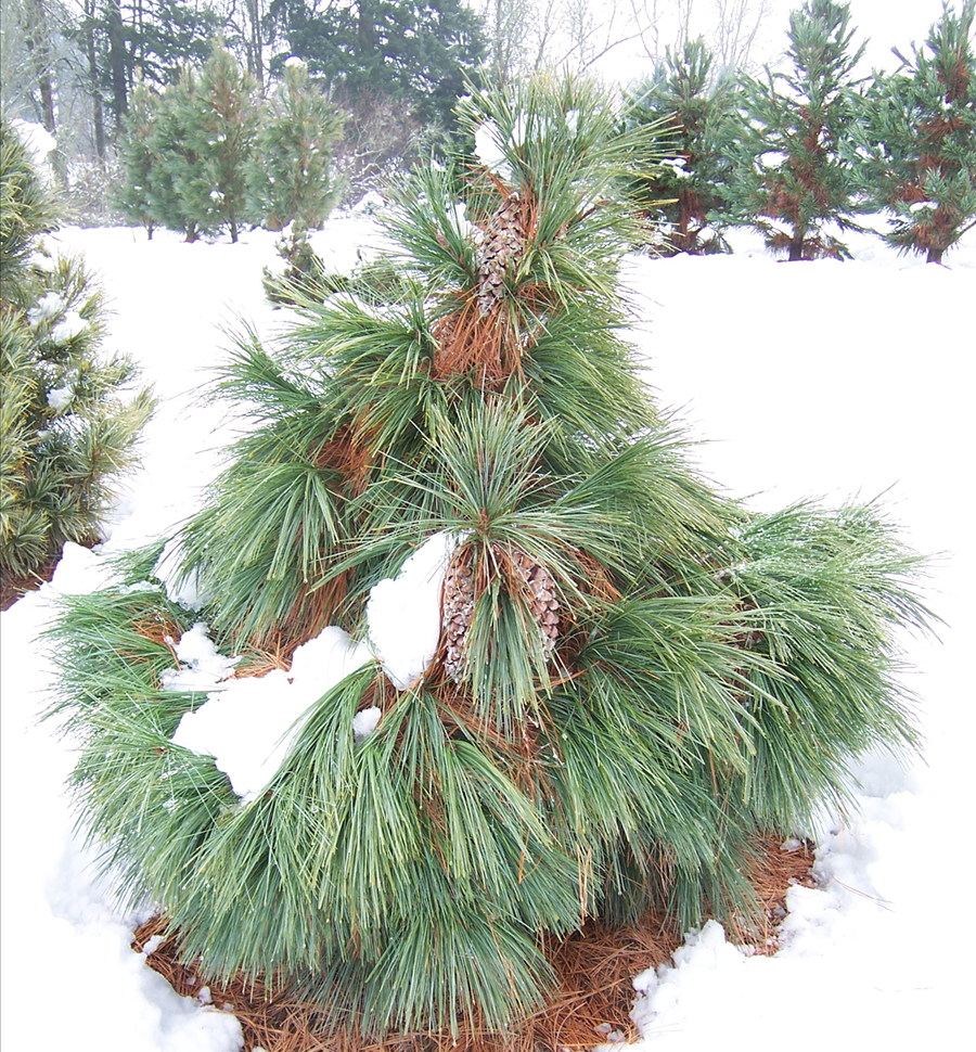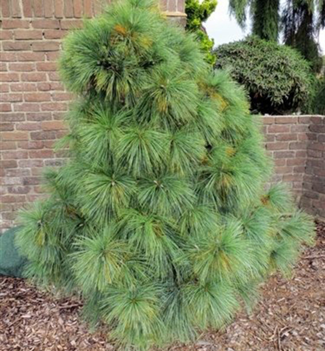 Hustá, dominantná kužeľovitá borovica s dlhými, jasno zelenými ihlicami.