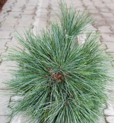 Trpasličia, pomaly rastúca guľovitá borovica s tmavozeleným ihličím.