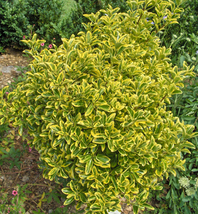 Vždyzelený nižší ker s tmavozelenými listami a kontrastnými mladými výhonmi ružovej farby.