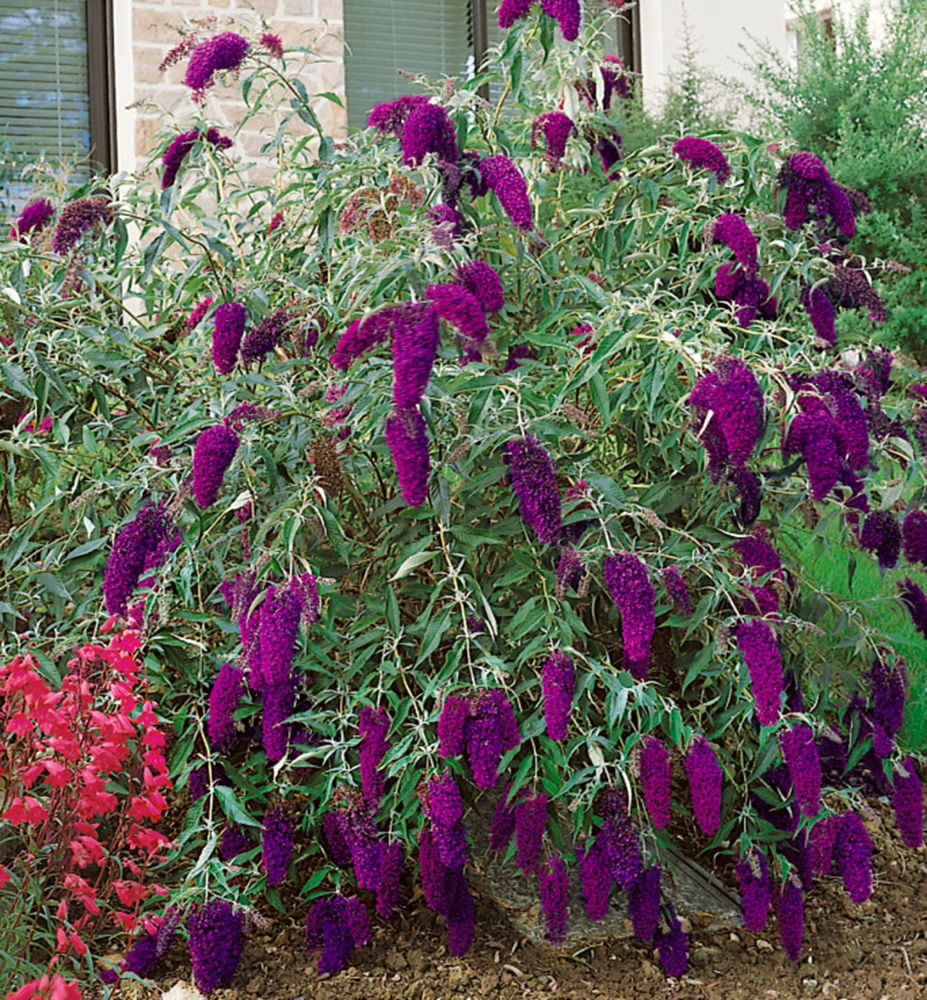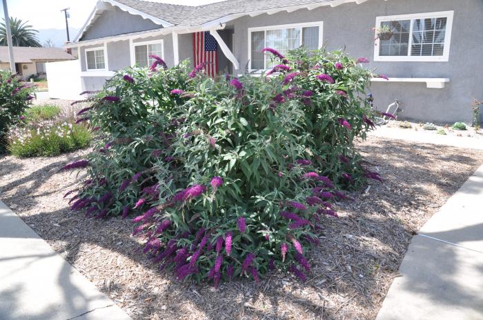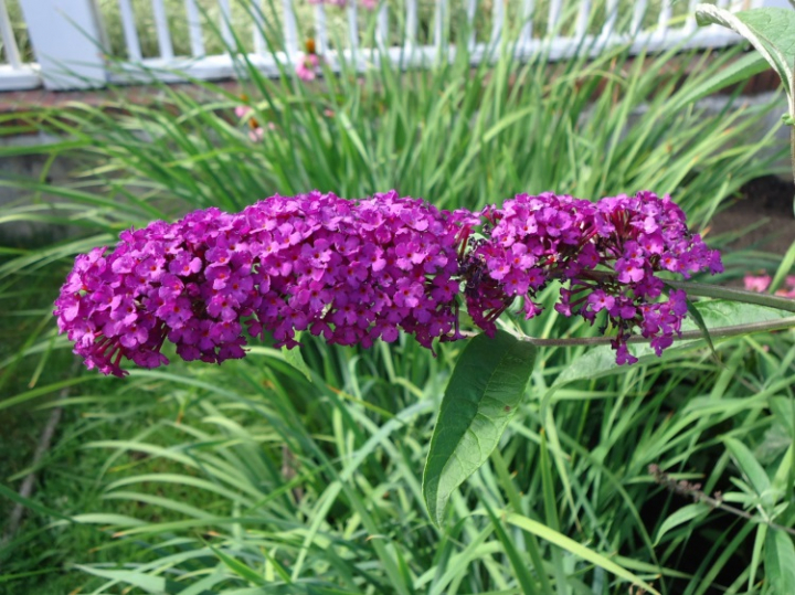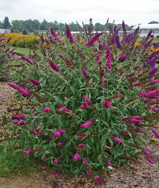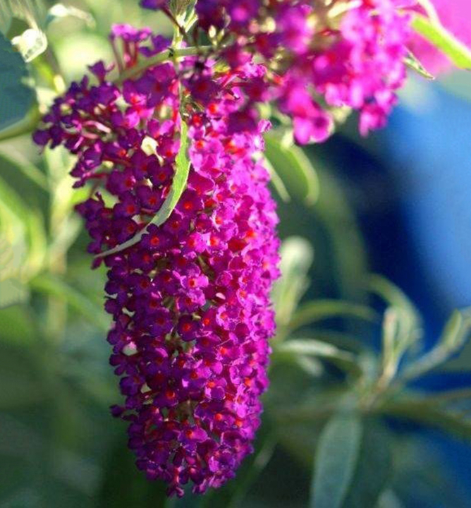 Bohato kvitnúca budleja s výraznými kvetmi cyklaménovofialovej farby.
