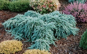Stĺpovitá borievka s modrozeleným ihličím so strieborným nádychom.