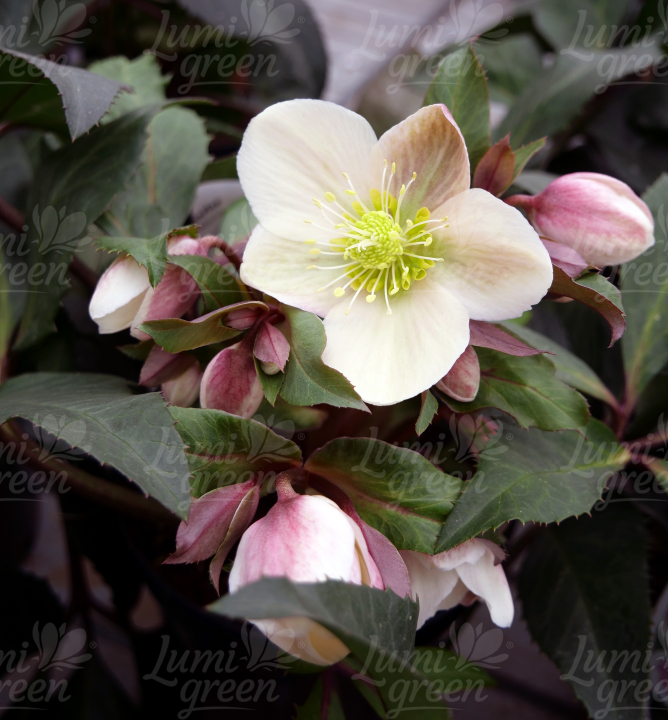 Charakteristika: Čemerica hybridná ´HGC® MALORY´, z elitnej línie Helleborus Gold Collection®, vyniká skorým kvitnutím a výnimočnou odolnosťou. Tvorí kompaktné, husté trsy so silnými, tmavozelenými, kožovitými listami, ktoré si zachovávajú dekoratívny vzhľad po celý rok. Rastlina dorastá do výšky 30-40 cm a šírky približne 40 cm, čo ju robí ideálnou pre výsadbu do záhonov, pod kríky, k okrajom chodníkov alebo do okrasných nádob. Kvety sú veľké, krémovo-ružové, s jemným ružovým nádychom v púčiku. Počas kvitnutia môže nadobúdať elegantné ružové a zelené podfarbenie.