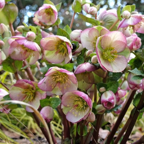 Elegantná čemerica s krémovozelenými kvetmi a nepravidelným ružovým sfarbením.