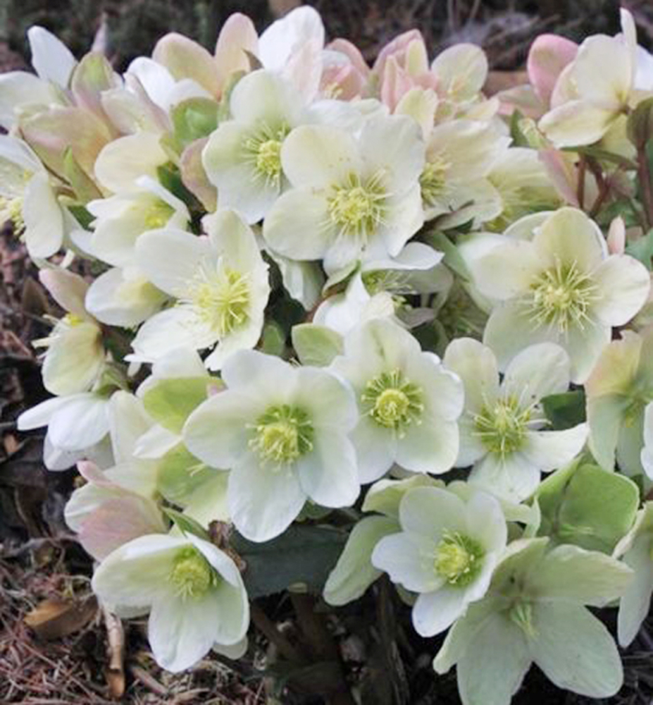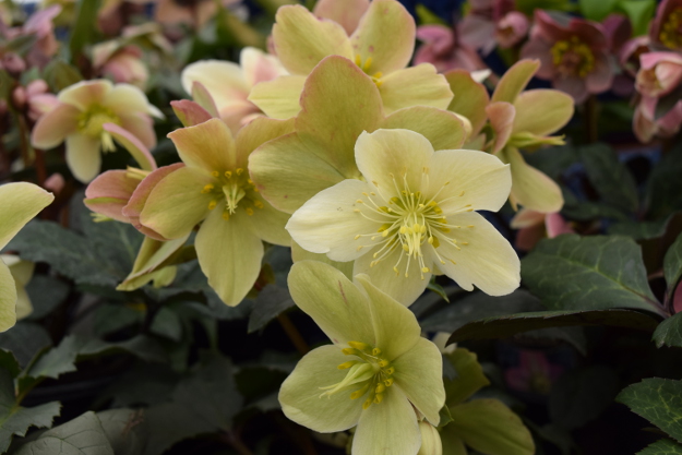 Stálezelená elegantná čemerica s krémovo-ružovými kvetmi, vhodná na výsadbu do črepníka.