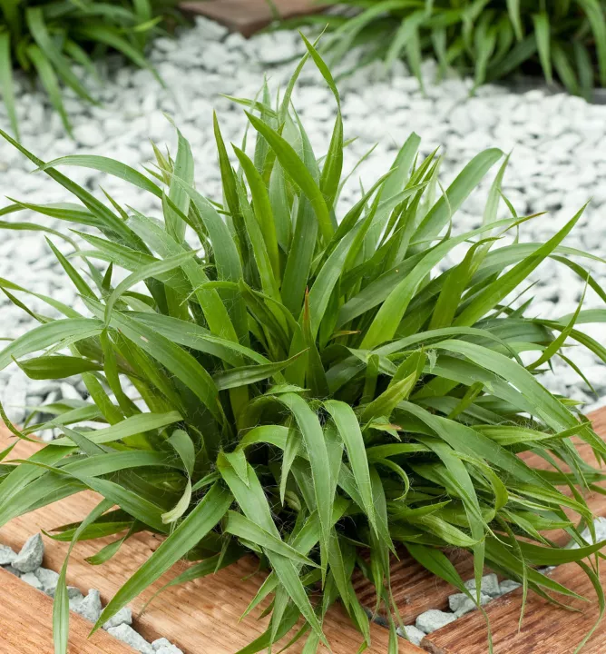 Vždyzelená okrasná tráva tvoriaca hustý trs dlhých zelených listov.