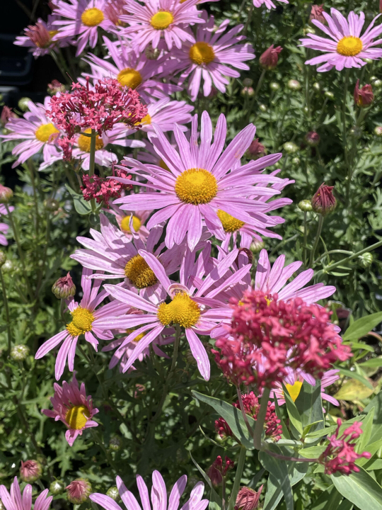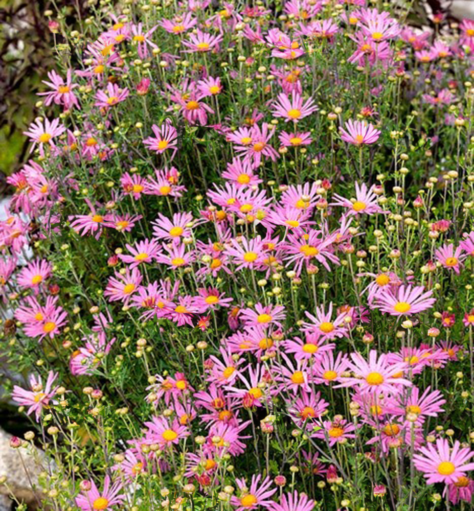 Bohato kvitnúca jesenná trvalka so svetloružovými kvetmi a žltými stredmi.
