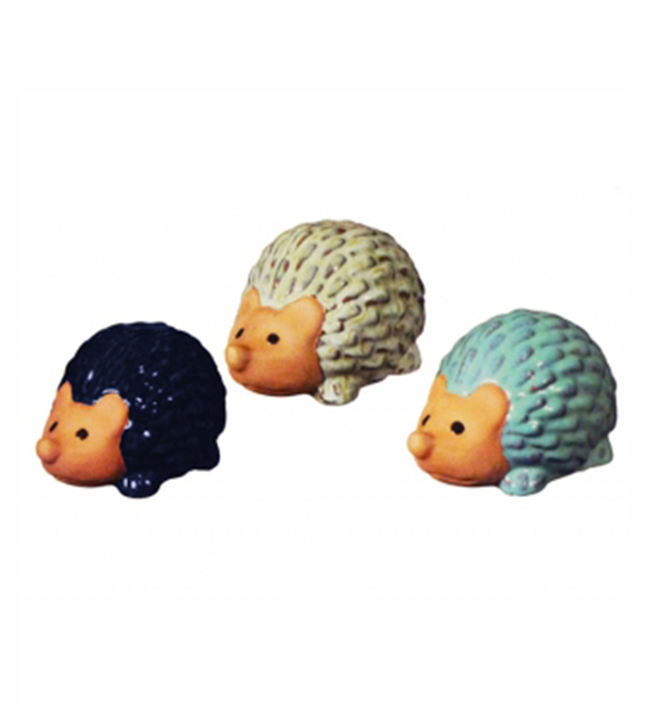 Ježko s lesklými glazúrovanými pichliačmi, keramickou tvárou a čiernymi očami.